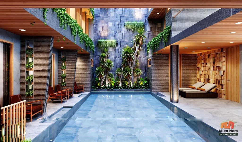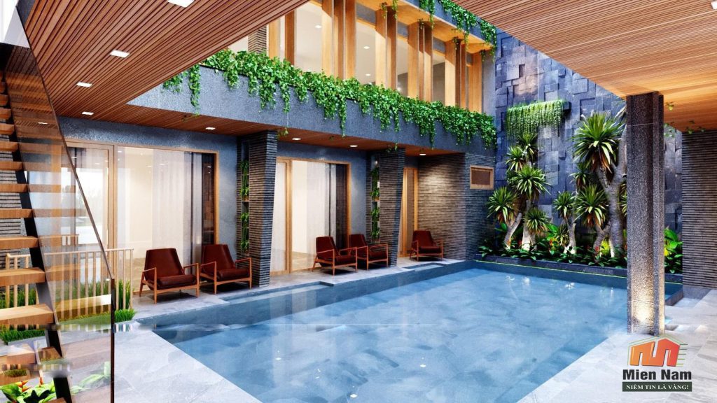 -Khuôn viên rộng: Biệt thự thường được xây dựng trên khu đất rộng, cho phép tạo ra một khuôn viên hoành tráng, có vườn cây, hoa, bể bơi và các tiện ích ngoài trời khác.