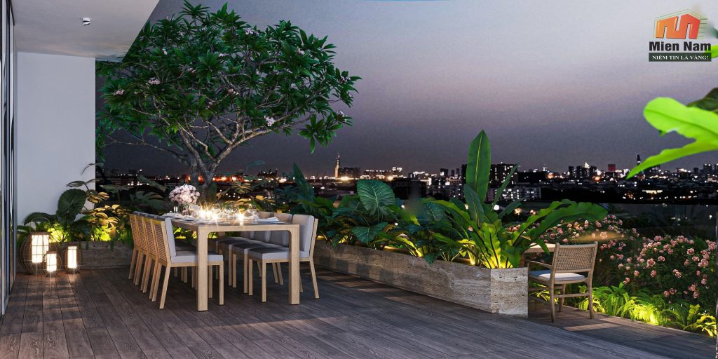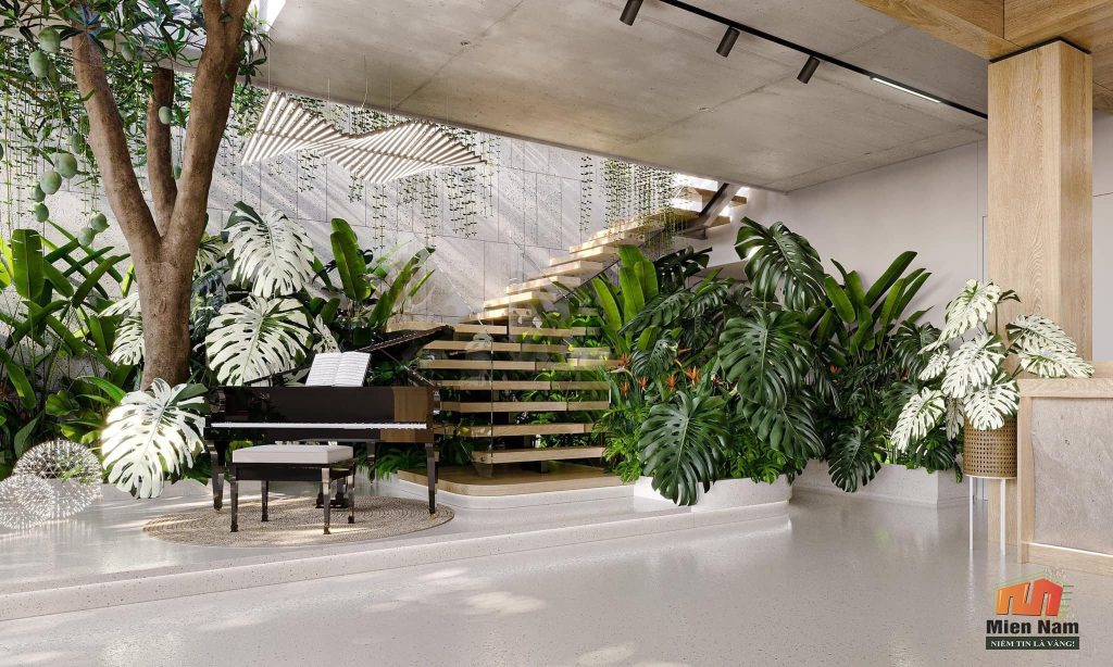 -Thiết kế môi trường sống xanh: sử dụng các khu vườn, khu vườn thượng uyển và khu vực xanh trong khuôn viên nhà để giúp giảm thiểu nhiệt độ, giảm độ ồn và tạo ra không gian sống thoải mái, dễ chịu.